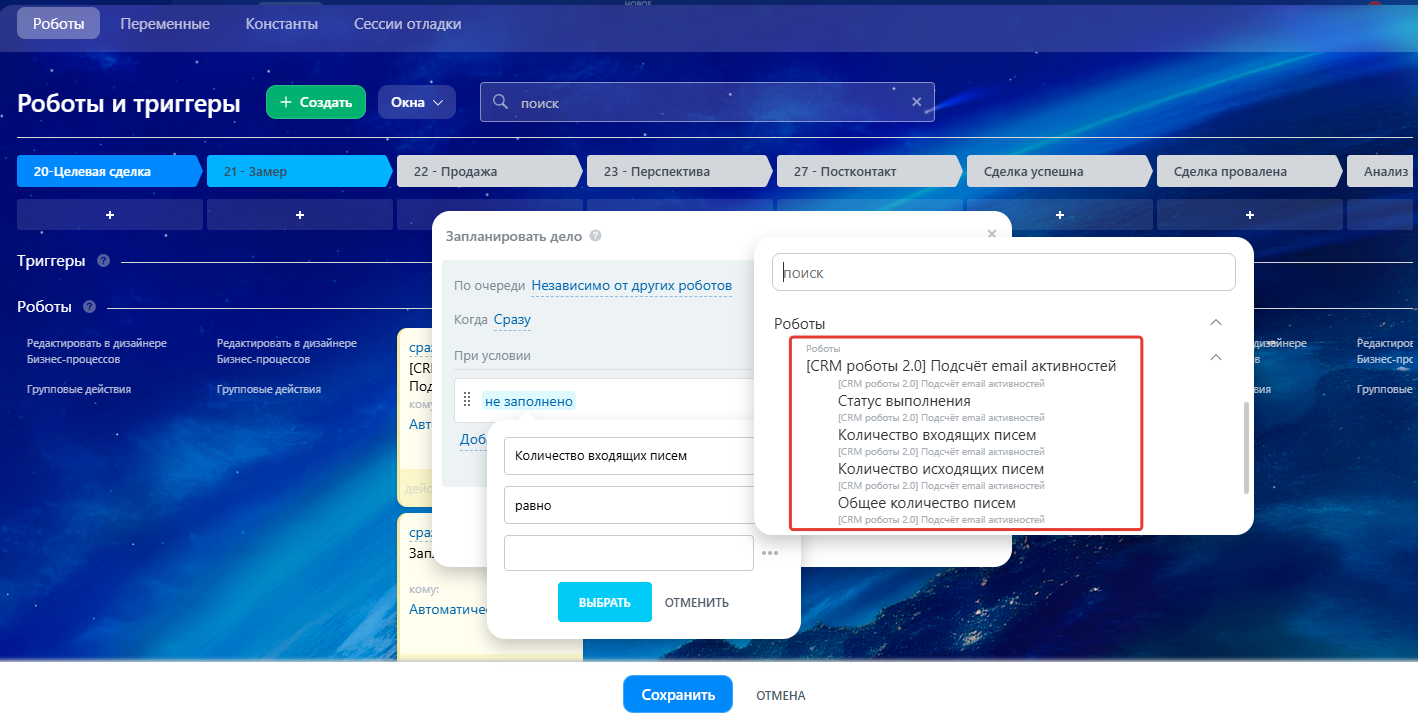 Робот полезен, когда нужно понять, насколько активно велась переписка по сделке, лиду или другой сущности.