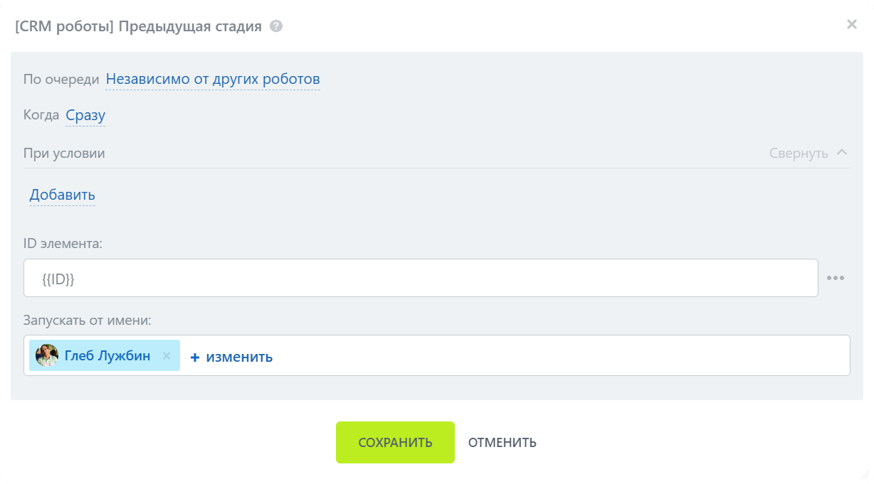 У робота нет настроек, кроме указания ID элемента. Только стандартные “когда выполнить” и условия выполнения.